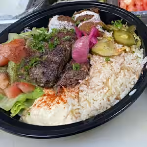 Tabbouli, hommous, baba ghanouj, shish kabob, shish tawook, shish kafta. Served with rice or fries and salad or soup.