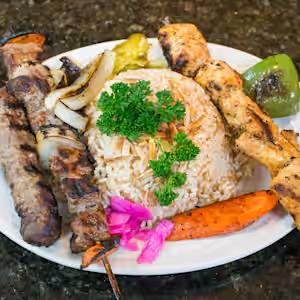 Shish kabob, shish tawook and shish kafta. Served with fries or rice and soup or salad.