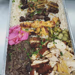 Serves 8. Two shish kafta, 2 chicken kafta, 2 shish tawook, 1 shish kabob, cream chops, mixed shawarma, hummus and garlic. Served with fries or rice and soup or salad.